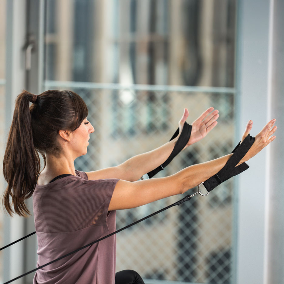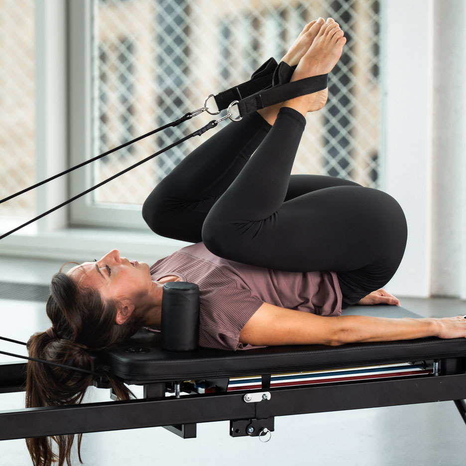 Poți face un antrenament acasă pe Reformer Pilates care este perfect pentru începători: Frânghiile, arcurile și căruciorul îți oferă sprijin direcționat, astfel încât să poți efectua mișcările în siguranță și într-un mod controlat. De asemenea, benzile elastice îți permit să ajustezi intensitatea la nivelul tău.