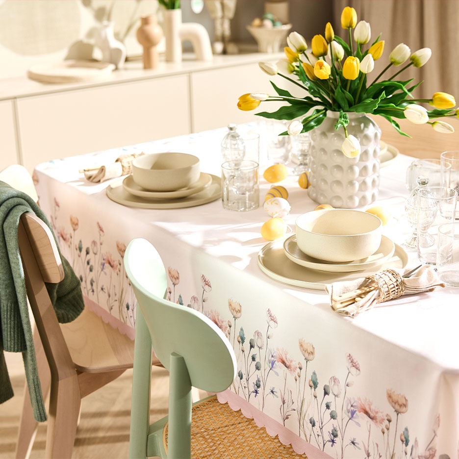 Fie că găzduiești un brunch fastuos de Paște, fie că te bucuri de cafea și tort pentru doi: masa voastră de Paște se aranjează practic singură. O față de masă proaspătă de primăvară transformă fiecare masă în piesa centrală perfectă pentru sărbătoarea de Paște. Dacă optezi pentru motive naturale de flori de câmp și culori la modă, fața de masă vă va însoți nu numai în perioada sărbătorilor de Paște, ci și primăvara, vara și toamna.