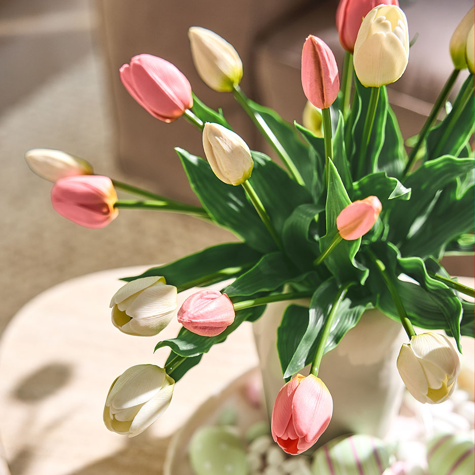 Nu trebuie să mergi la florărie sau în grădina ta pentru asta. Un buchet de lalele artificiale de înaltă calitate este aproape imposibil de distins de original - și rămâne proaspăt pentru totdeauna. Dacă vrei să dai buchetului o notă personală, amestecă florile cu crenguțe de salcie cu boboci, de exemplu, și decorează totul cu etichete cu ouă de Paște. Profesioniștii în decorațiuni se bazează pe culori armonioase, dar imaginația ta nu are limite.
